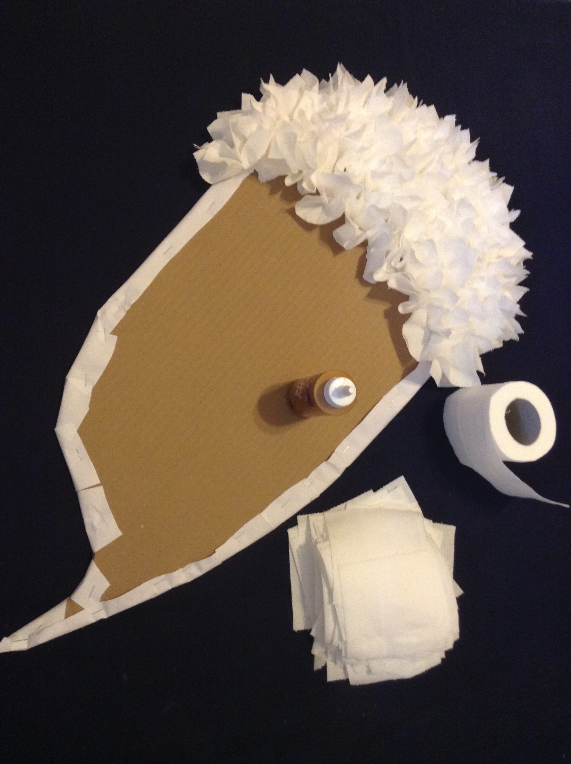 Step 3: Tear the roll of toilet paper into individual squares. Take one square and bunch it up in the middle and apply tacky glue at the tip and stick it to the top of the cardboard side of your wings.